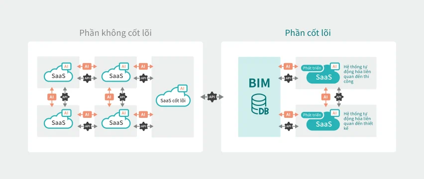 Kết hợp mô hình liên kết ứng dụng và AI, kết nối liền mạch nhiều SaaS. Trong lĩnh vực không cốt lõi, tích hợp các ứng dụng phụ trợ xung quanh SaaS cốt lõi để tối ưu hóa hiệu quả công việc. Hơn nữa, trong lĩnh vực cốt lõi, kết nối các hệ thống liên quan đến thiết kế và thi công với BIM, AI sẽ tự động hóa các nghiệp vụ lặp đi lặp lại và xử lý dữ liệu giúp giảm đáng kể gánh nặng công việc. Việc tích hợp AI sẽ thúc đẩy mạnh mẽ quá trình tự động hóa và nâng cao hiệu suất vượt qua giới hạn truyền thống.