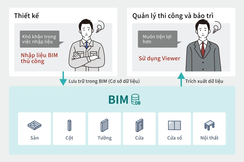 Thách thức chính trong việc triển khai BIM là gánh nặng nhập liệu. Ngoài dữ liệu CAD truyền thống, cần phải nhập dữ liệu thuộc tính, điều này đặc biệt tốn thời gian và công sức trong giai đoạn thiết kế và tạo bản vẽ thi công. Tuy nhiên, việc tận dụng dữ liệu tích lũy từ BIM có thể cải thiện đáng kể hiệu quả trong quản lý thi công và bảo trì. Bằng cách sử dụng thông tin từ RPM (Rapid Prototyping and Manufacturing), chúng ta có thể biến những quy trình này thành các công cụ hiệu quả hơn. Tuy nhiên, thực tế là hiện tại những chức năng này vẫn chưa được tận dụng đầy đủ.